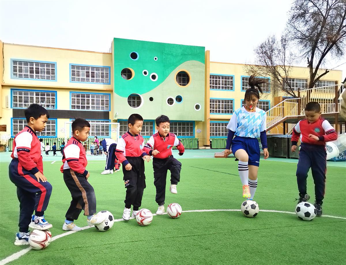 冯梦琦除了每天上午在班级中开展常规教育教学,下午带领当地教师共同开展足球特色课程,还成立了幼儿园足球队。从制定出幼儿园足球队规章制度,再到建立幼儿园足球教师队伍,她先后谋划开展足球月、足球嘉年华、足球毕业杯联赛、石榴杯友谊赛等活动。越来越多的孩子可以体验到足球运动带来的快乐,幼儿园里足球运动的氛围也愈加浓厚。努尔江的妈妈说:“儿子特别喜欢冯老师,爱屋及乌也爱上了足球,并成了足球队小队长。努尔江加入足球队以后不再娇气,跌倒了也学会自己爬起来,有了男子汉的样子,回家后能主动承担一些家庭劳动了!”