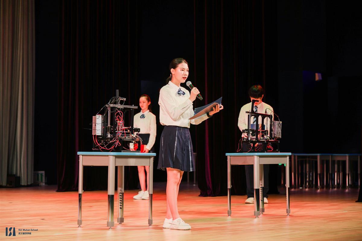 舞台上,学生团队控制电脑,使3D打印机按照预设的数字模型,通过逐层打印的方式将材料构造成了三个立体的字母——“ISA”,这正是武汉爱莎文华高中的校名缩写,生动的展示收获了在场家长的热烈掌声。