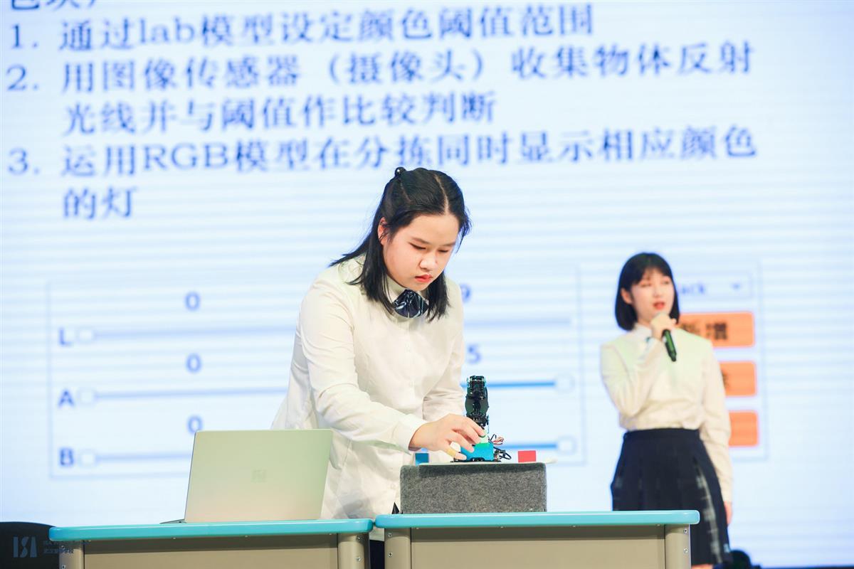 舞台上,学生们制作的一台机器人,完成了自动识别物块颜色,自动分拣、搬运等工作。制作团队的李敏宜同学从机器人的理论模型、运行原理、问题总结三个方面介绍制作机器人的过程。