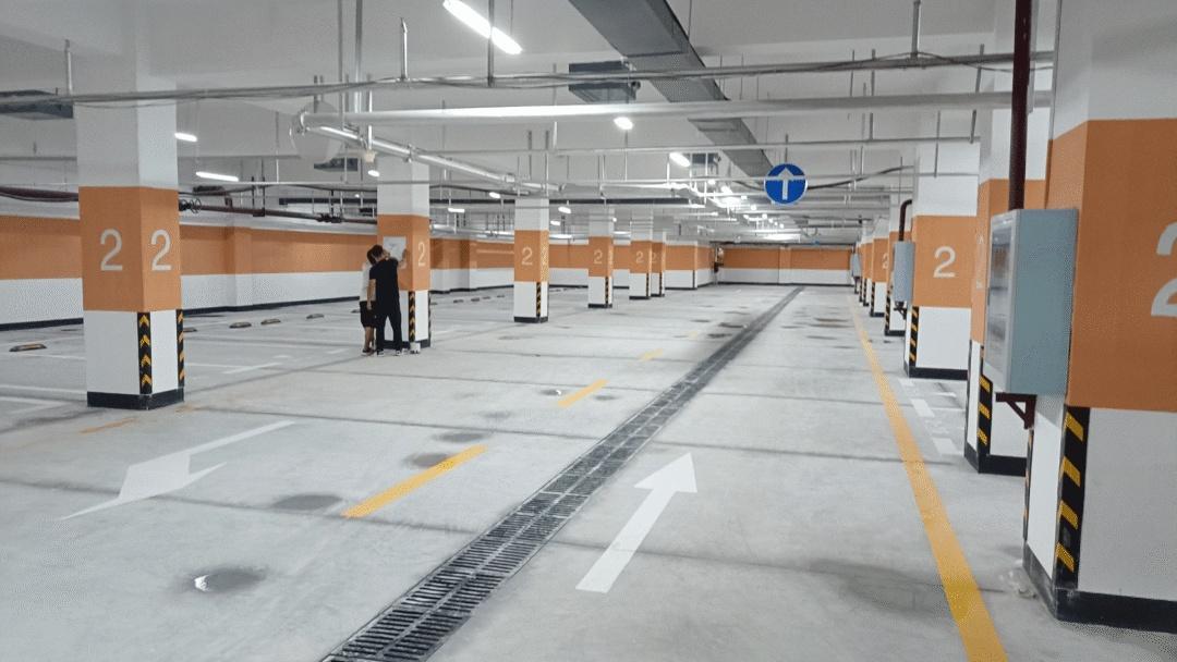 可提供148个地下停车位地面结实明亮、防尘防滑墙皮平整光滑、洁白无瑕弧线形节能雷达感应LED流水灯新标识的道路指示线地面铺设环氧地坪漆······