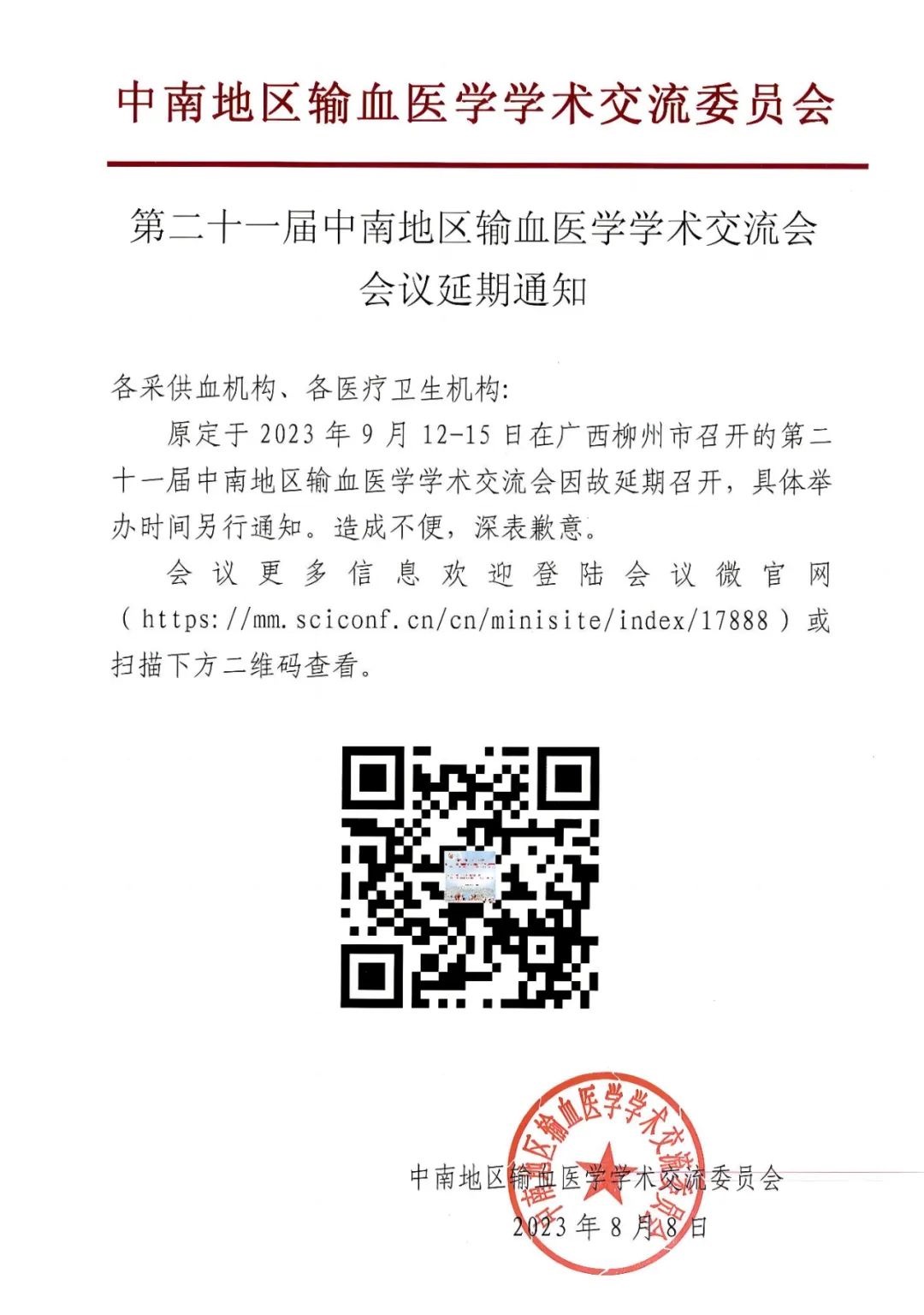 第二十一届中南地区输血医学学术交流会延期。图片来源:中南地区输血医学学术交流委员会官方微信