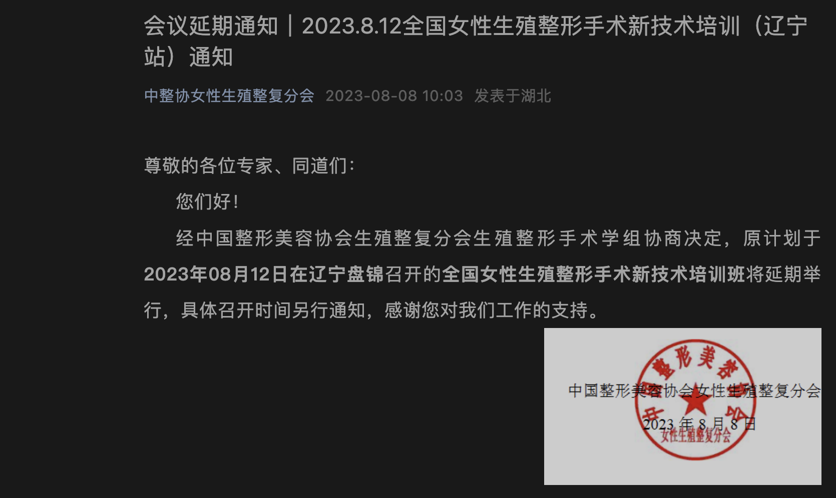 全国女性生殖整形手术新技术培训班(辽宁站)延期。图片来源:中国整形美容协会女性生殖整复分会官方微信