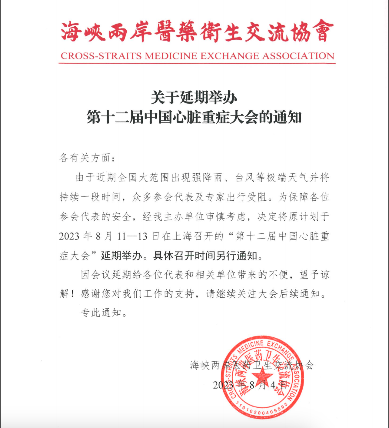 不过,也有机构表示,会议延期是受到台风天气影响。8月4日,海峡两岸医药卫生交流协会发布公告称:“由于近期全国大范围出现强降雨、台风等极端天气并将持续一段时间,众多参会代表及专家出行受阻。为保障各位参会代表的安全,经我主办单位审慎考虑,决定将原计划于2023年8月11-13日在上海召开的‘第十二届中国心脏重症大会’延期举办。具体召开时间另行通知。”