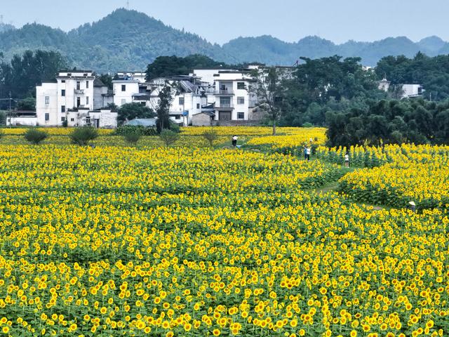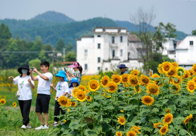 8月9日,游客在安徽省黄山市屯溪区屯光镇汉沙村欣赏向日葵花海。新华社发(施亚磊 摄)