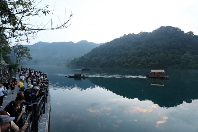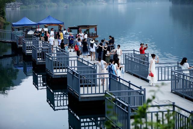 8月9日,游客在湖南省资兴市东江湖景区小东江景点游玩赏景。新华社发(李科摄)