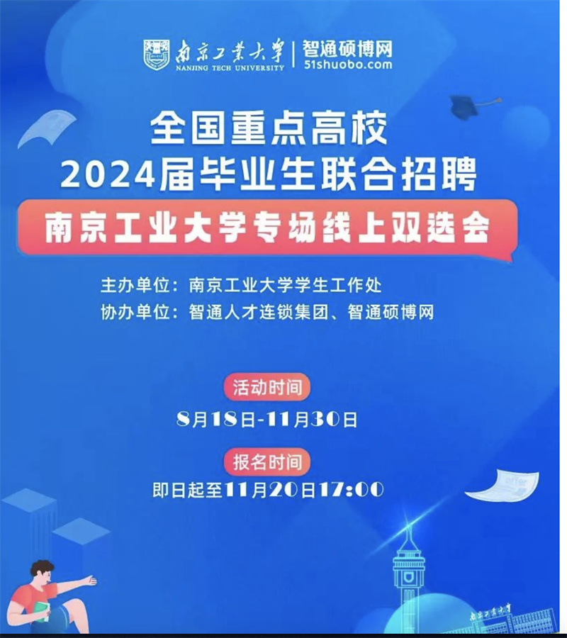 8月18日开始,南京工业大学联合多家单位启动全国重点高校2024届毕业生联合招聘暨南京工业大学线上双选会,为毕业生和企业搭建桥梁。