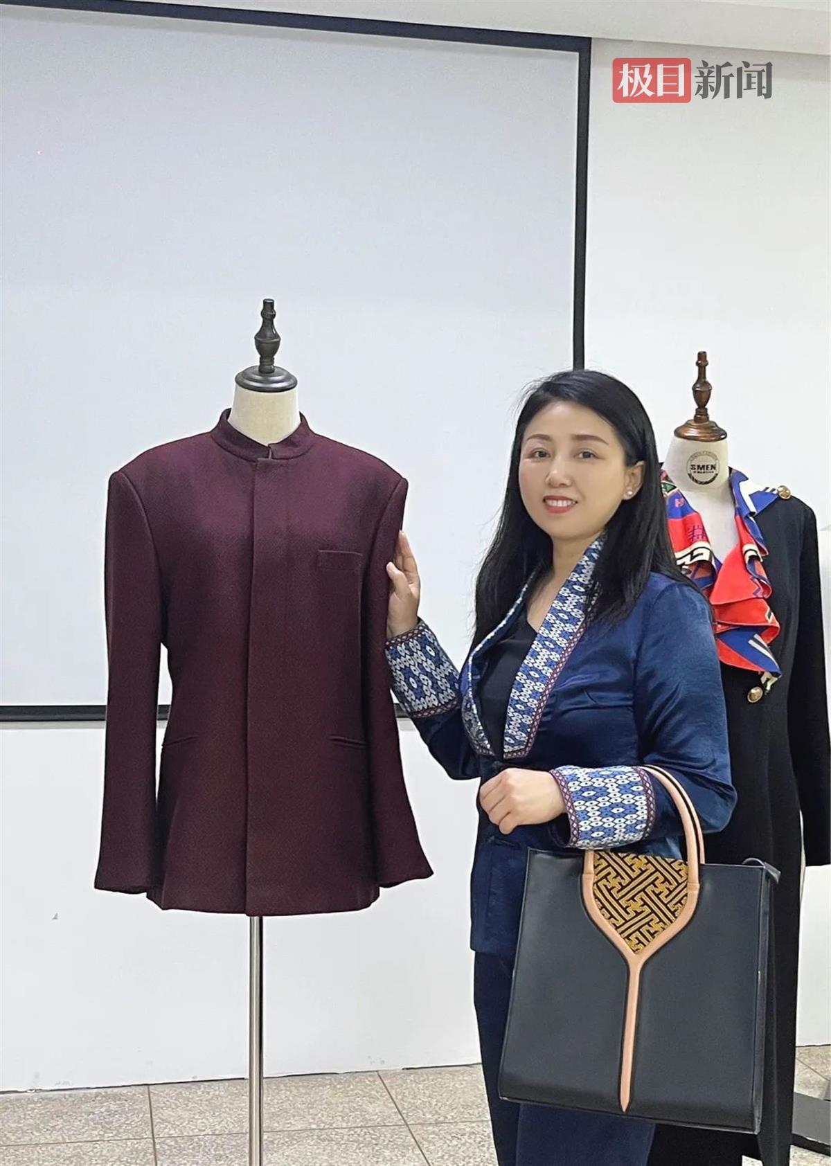 在恩施职业技术学院,极目新闻记者见到了用该面料制作的服装。10余件独具特色衣服陈列开来,西服、中山装、衬衣、长裙等各种样式一应俱全。一件棕色女士西服外套,左肩搭配着一块独具民族特色的披肩,披肩上是特色的西兰卡普图案,整体看起来十分轻薄。一件男式西服外套则全是由这一特殊面料制作,蓝色为主色调,同时印有经典西兰卡普图案……
