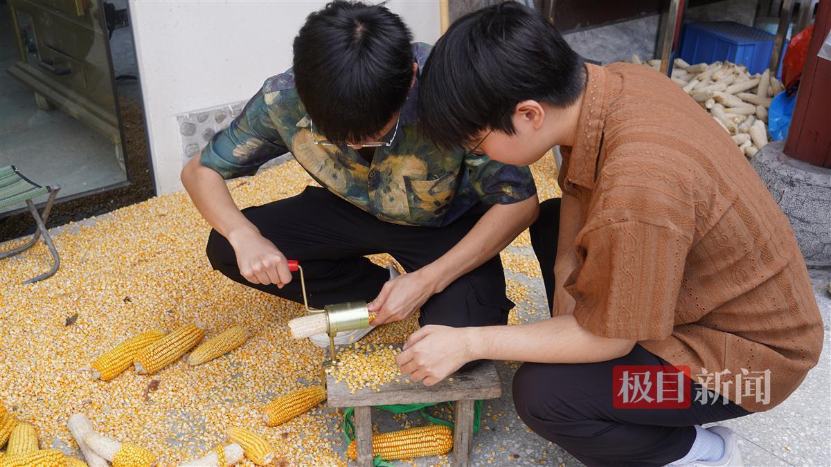 在这里,台湾大学生拿起农具,学起了剥玉米,体验农家生活。