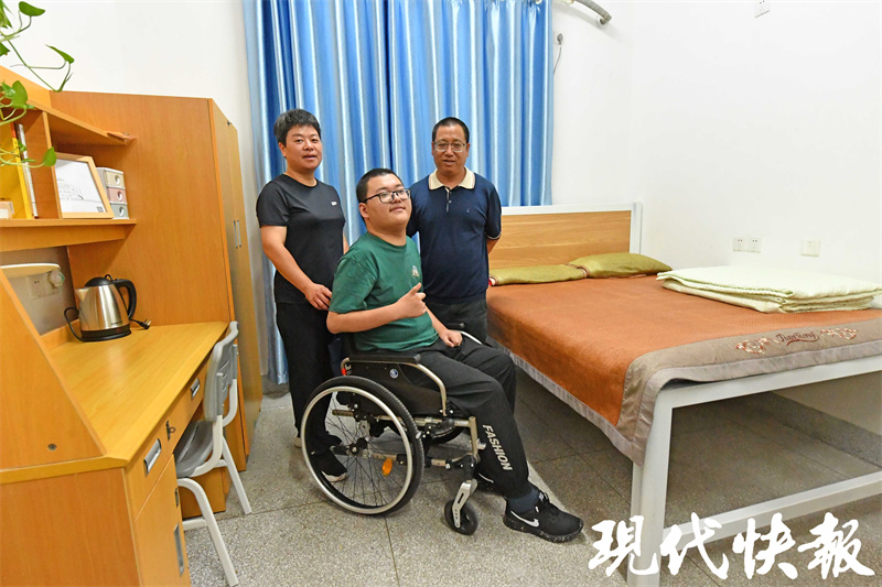 就在前一天晚上,董亦超和父母从启东驱车来到东大。“进门就有一束鲜花映入眼帘,这是老师们特地为我买的。床也是特别为我定制的,一看就和其他宿舍的不一样。就连书柜里放的书,也是学校特别为我挑选的。”