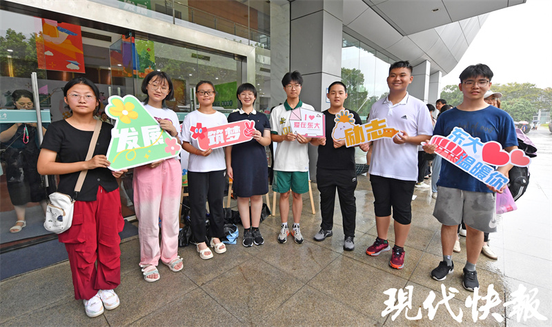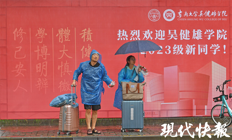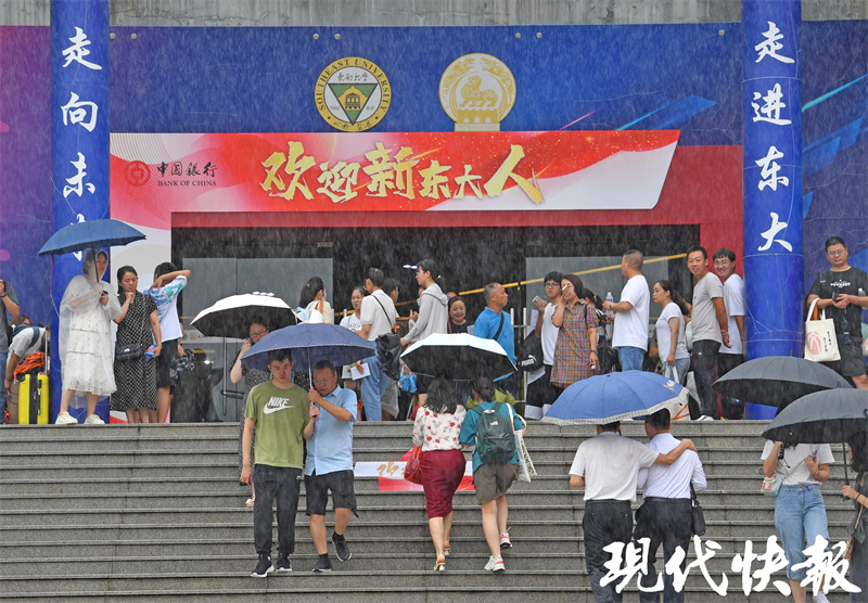 “你好,新东大人”“最好的时代,在最好的东大,遇见最好的你们”……8月22日,东南大学2023级本科新生开启报到模式。虽然下着大雨,但挡不住家长和新生的热情,安静了近两个月的校园重新热闹起来。现代快报记者了解到,2023年,东南大学共录取本科新生4117人,励志的学霸有很多。其中年龄最小的只有15岁。有学子穿越一条马路,在家门口上大学;也有学子跨越万里,坐了近50个小时的火车来东大求学。