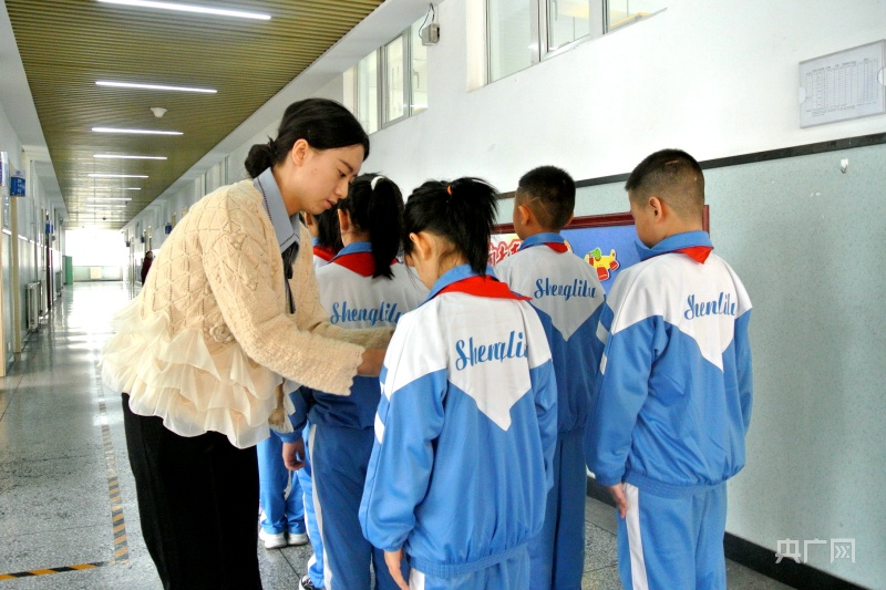 老师带领一年级新生学习排队站姿(央广网记者汪晓青摄)