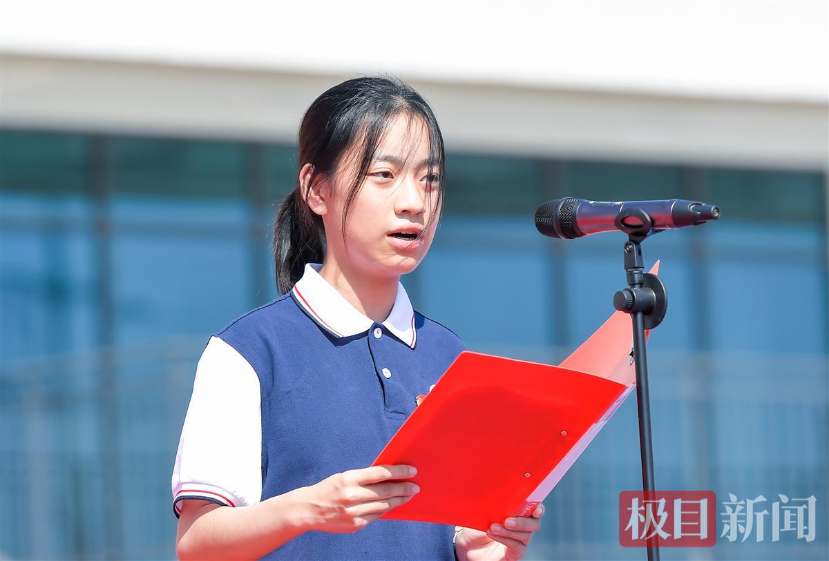 “身为金高的首批学生,我们要以自己的实际行动和成绩展示新学校的形象。身为新时代新青年,我们要努力成为国之栋梁,将自己奉献于祖国,创造中华民族更高的辉煌。”高一12班学生朱子乐,作为学生代表发言时表示。
