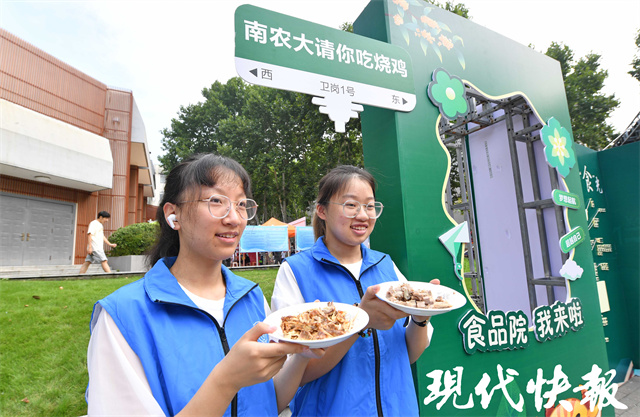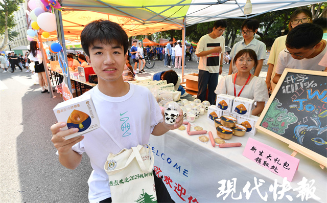 迎新现场,该校食品科技学院精心制备了超美味的南农烧鸡,新生和家长现场品尝。不仅如此,学院还为新生制作了五件套“吃货迎新大礼包”,香肠、酸奶、饼干、面包、花胶,分别代表学院现有五大学科方向。