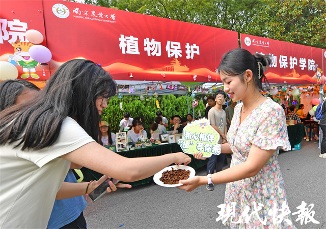 在迎新现场,虎凤蝶协会也摆出了能吃、能赏的“昆虫派对”,植物保护学院科普部刘奕辰说:“昆虫是植物保护专业的重要组成。在专业领域,我们会进行昆虫分类、生理、生态的研究,这些研究对于我们防治害虫有很大的帮助。”