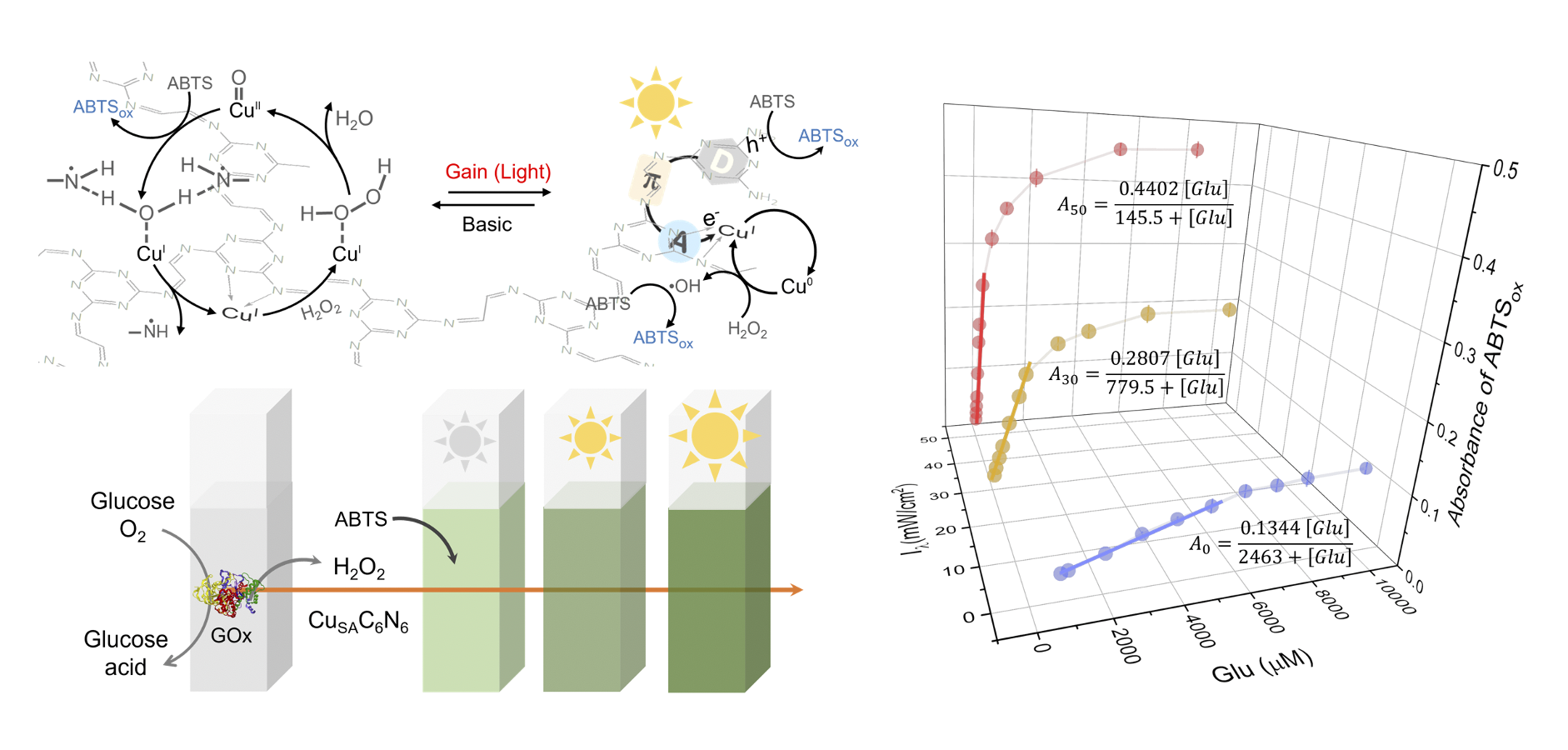 鉴于此,东南大学张袁健团队报道了一种铜单原子催化剂(CuSAC6N6),它由电子供体-π-受体桥联的新型拓扑结构氮化碳(C6N6)和铜原子构成。CuSAC6N6不仅可以通过结合态铜-氧中间体途径实现基础氧化反应,还可以在相同条件下通过光激活游离态自由基途径引发第二条增益反应。CuSAC6N6独特的拓扑结构以及电子给体-π-受体桥联官能团促进了分子内电荷的分离和迁移,从而排除了上述两种催化途径之间电子转移的干扰问题。实验结果证明了CuSAC6N6不仅具有优异的基础活性,并且在室内照明灯照射下,还可以获得高达3.6倍的增益效应。基于CuSAC6N6的自适应能力,该团队进一步构建了体外智能切换灵敏度和线性检测范围的葡萄糖智能生物传感器。考虑到光照优异的时空分辨率和高度可控性,该研究报道的自适应生物传感器将为智能人工设备提供集成度更高的动态化学传感界面。