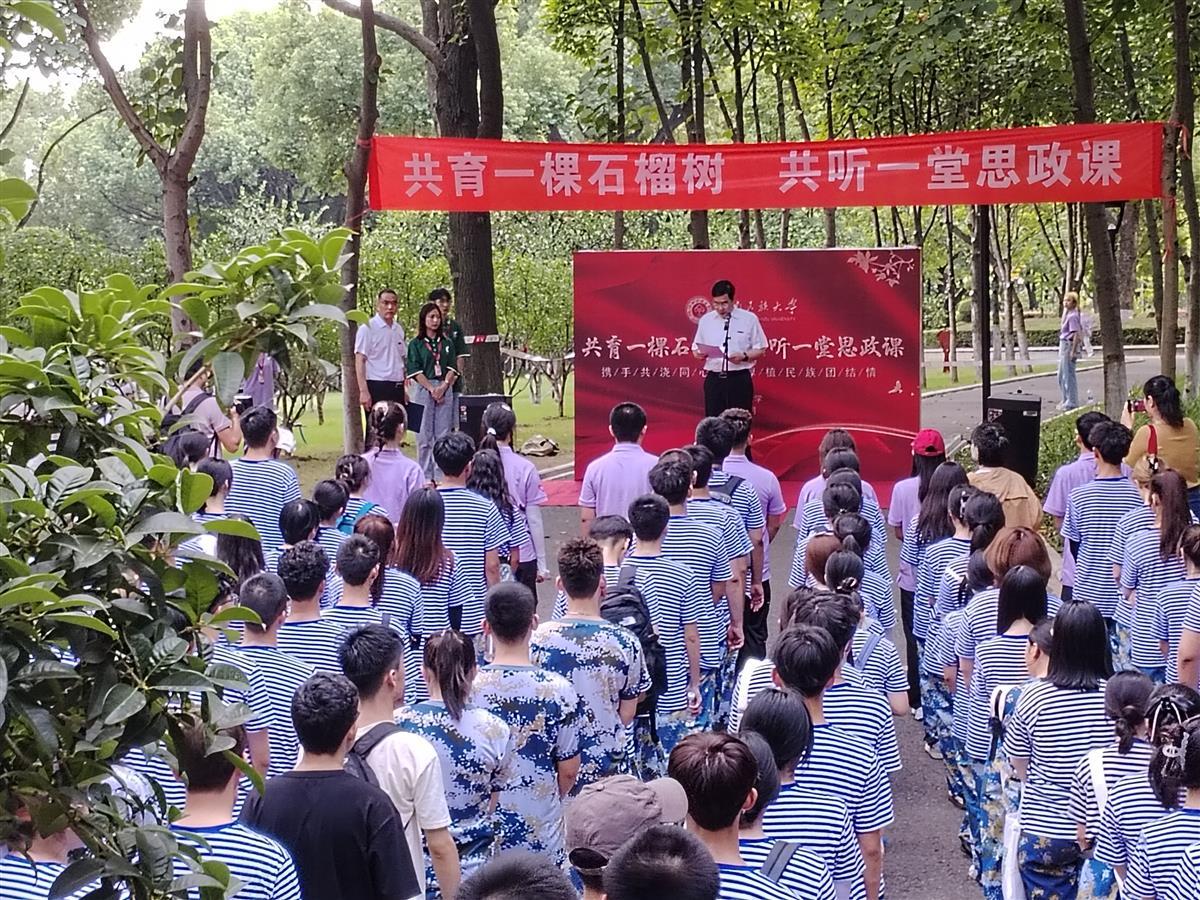 9月8日,是中南民族大学新生报到的日子,来自全国各地的新生齐聚南湖之畔,双子塔下。同学们带着好奇的目光打量着新环境,上一秒还彼此陌生,下一秒却因一瓶“家乡水”拉近了距离。这是该校“共育一棵石榴树,共听一堂思政课”活动上的一幕。来自五湖四海的民大学子们齐聚南湖园石榴园,将各自从家乡带来的水源,作为象征着青年学子积极铸牢中华民族共同体意识的团结之水,浇灌到石榴林里,共育一棵石榴树,共听一堂思政课。