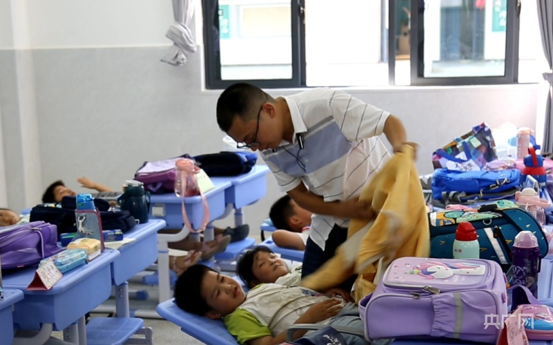 老师给学生们盖毯子(央广网发徐会刚摄)