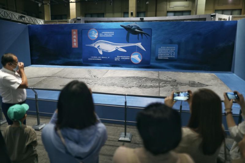 9月19日,国家自然博物馆,观众在观看七八米长的梁氏关岭鱼龙化石。新京报记者浦峰摄