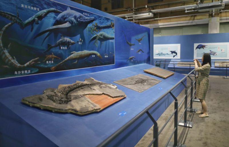 9月19日,“龙跃黔海——贵州三叠纪的海洋世界”展览在国家自然博物馆阳光厅开展,观众在现场观看展览。新京报记者浦峰摄