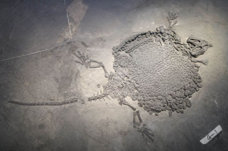 2.52亿年前,地球上爆发了地史上规模最大的生物灭绝事件,81%的海洋生物和89%的陆地生物在短时间内消亡。400万年后,地球生态系统逐渐复苏,一些陆地爬行动物重返生态环境更好的海洋,成为生物演化进程中的“逆行者”。重返海洋的鱼龙最先抓住先机,迅速辐射演化,再次适应水生生活,荣登三叠纪海洋霸主之位,统治海洋长达1亿余年之久。展览展出了邓氏贵州鱼龙、关岭鱼龙、胡氏贵州龙等丰富、独特且保存精美的鱼龙化石标本50件,最震撼的要数展厅里长达七八米的贵州鱼龙标本。“鱼龙是重返海洋的爬行类动物中适应能力最强的,仔细观察可以发现,为了适应海洋生活,它除了演化出流线型体型,还有大大的眼睛和眼眶,以此在深海里保持很好的视力。它还演化出了尾弯,就是尾椎神经棘的差异排列,方便它们在海洋里快速游泳,这件梁氏关岭鱼龙就是已经适应远洋生活的典型。”国家自然博物馆助理研究员刘爽说。