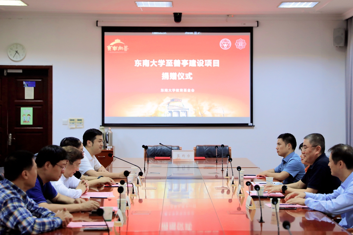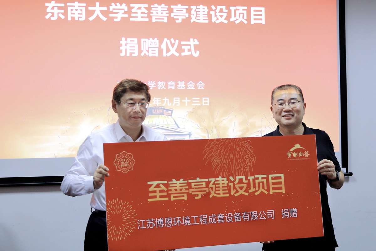 【东大新闻网9月21日电】(通讯员王玺杰摄影郭珂宇)近日,东南大学至善亭建设项目捐赠签约仪式在四牌楼校区老图书馆举行。江苏博恩环境工程成套设备有限公司董事长、东南大学机械工程学院1990级校友蔡泉生,东南大学医学院1987级校友肖磊,东南大学副校长、教育基金会常务副理事长黄大卫出席仪式。