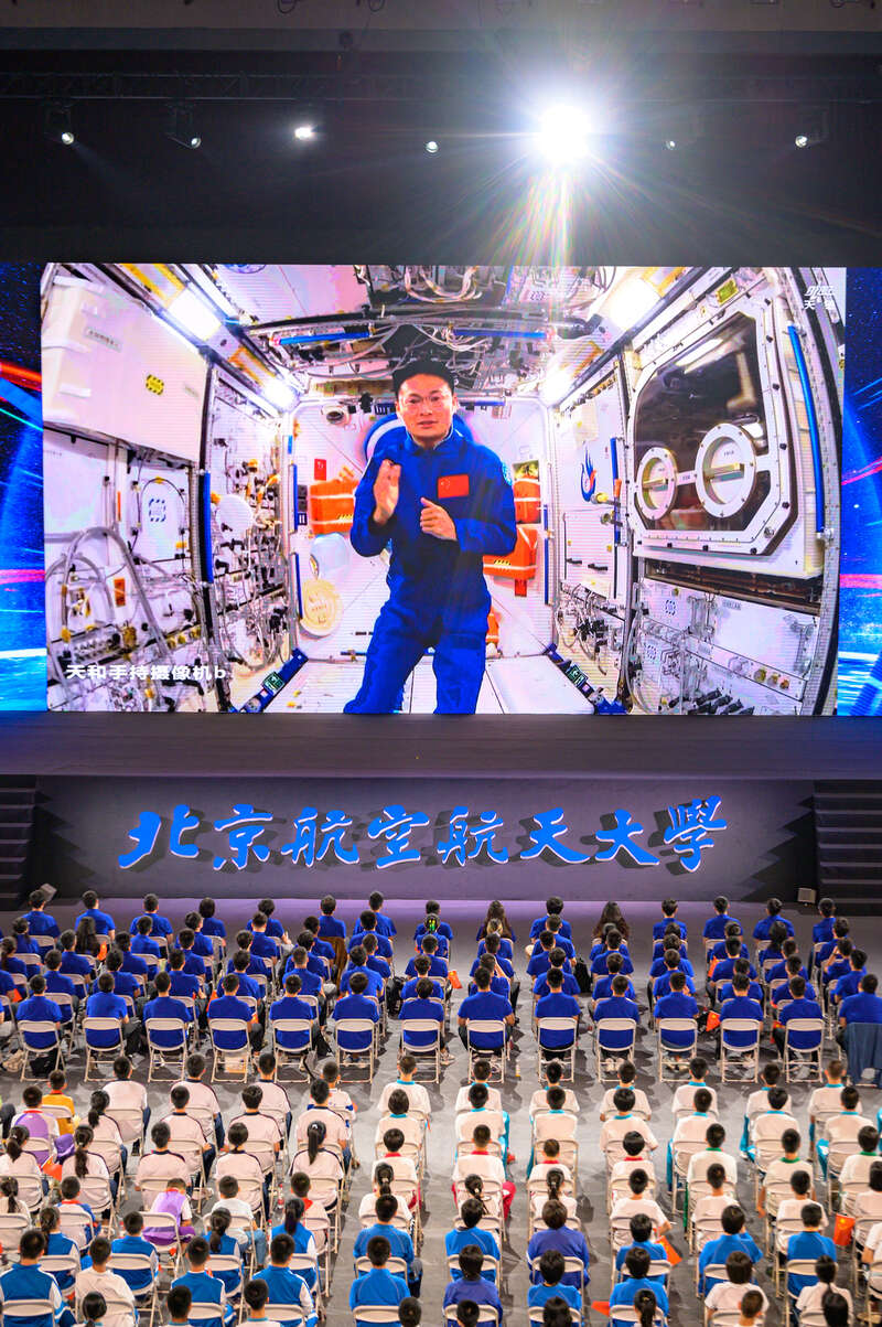 “天宫课堂”北航地面主课堂现场,大屏幕上为航天员桂海潮。北航供图