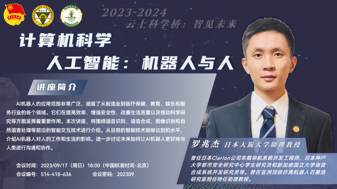 近日,在全国科普日来到之际,东南大学-支教地“云上科学桥:智见未来”AI科普活动在云南省楚雄彝族自治州南华第一中学(示范部)举行,同时在内蒙古自治区巴彦淖尔市五原县第一中学和新疆生产建设兵团第三师图木舒克市第二中学设立分会场。本次科普活动以“科普筑梦创引未来”为主题,首场活动邀请日本大阪大学助理教授罗兆杰带来题为《计算机科学——人工智能:机器人与人》的讲座。