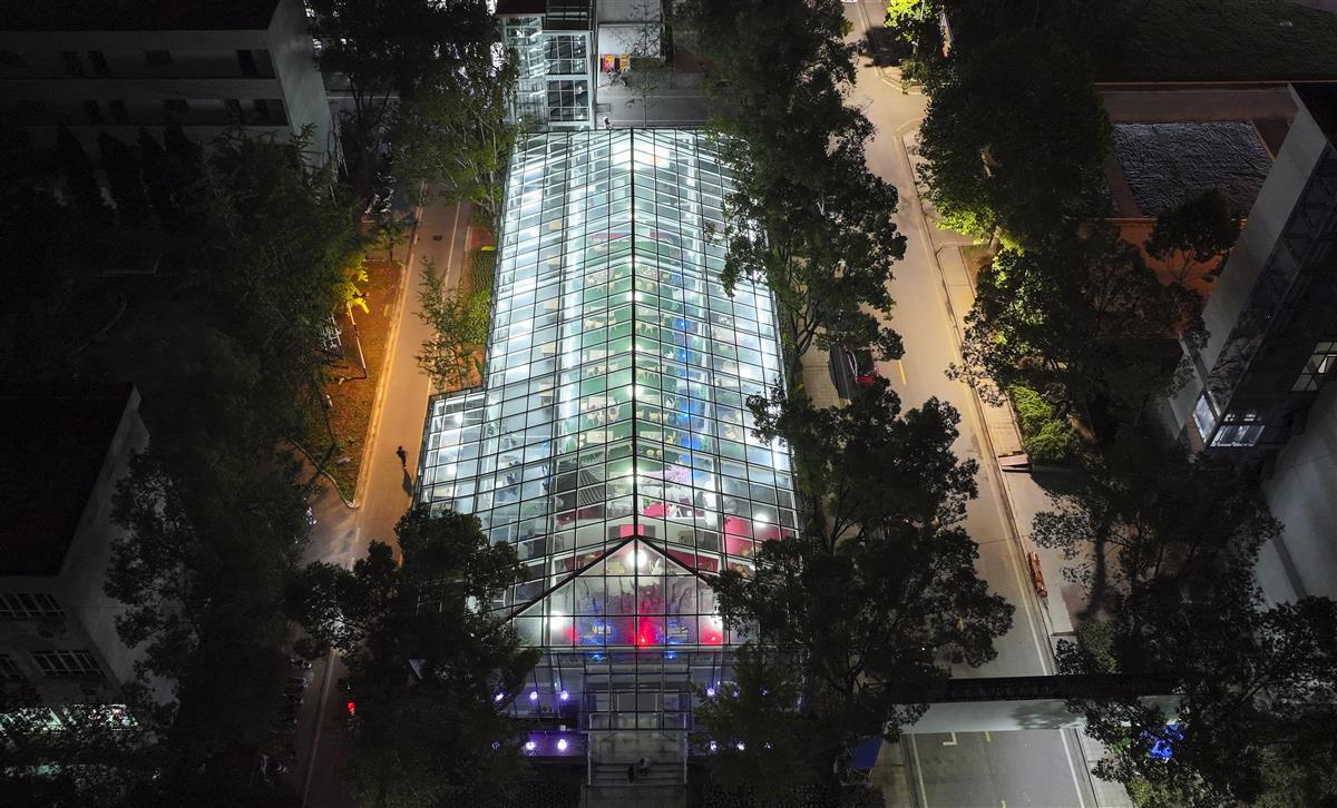 阳光倾泻,假山木亭,绿地红花,泉水潺潺,琴声悠扬;屋内世外桃源,屋外秋色正好,年轻的学子端坐窗边,或潜心阅读,或品尝佳肴,屋里屋外都如画卷般和谐美好……该校的这座新地标毗邻问天湖校园文化园区,与该校2022年10月落成开放的星辰书屋一样,由特殊钢结构玻璃幕墙建造而成,建筑面积逾千平方米,读者白天能沐浴阳光,夜晚能观星赏月。