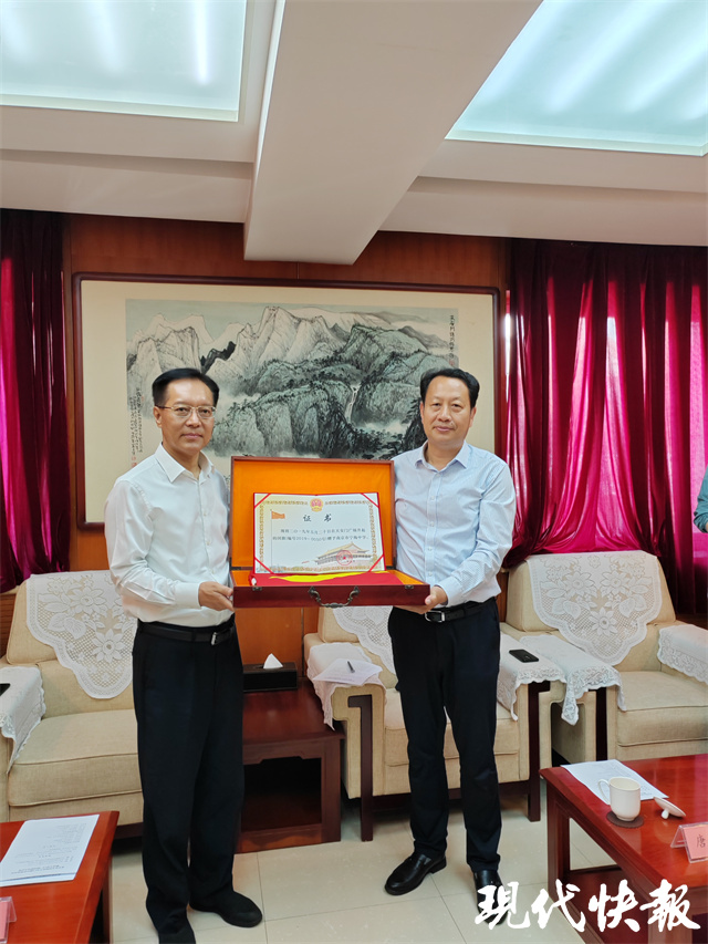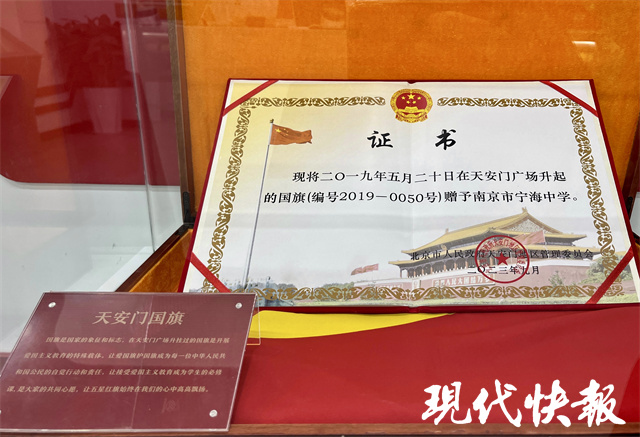 在馆内,记者见到了由北京市人民政府天安门地区管理委员会赠予学校国旗的证书,上面写着“现将二〇一九年五月二十日在天安门广场升起的国旗(编号2019-0050号)赠予南京市宁海中学”。在证书下方,是那面鲜红的国旗。