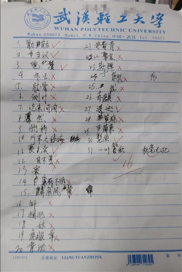 10月14日至16日,武汉轻工大学部分学院组织了汉字听写大赛初赛。“拿到题目的第一感受是题目非常难,出现了‘敝帚自珍’等一些生僻的成语和词语,让我有点不知所措。”该校人文与传媒学院广告学专业大一新生张佳馨表示,刚开始做题时就有点跟不上节奏,很多词语听着很熟悉,但就是写不出来。