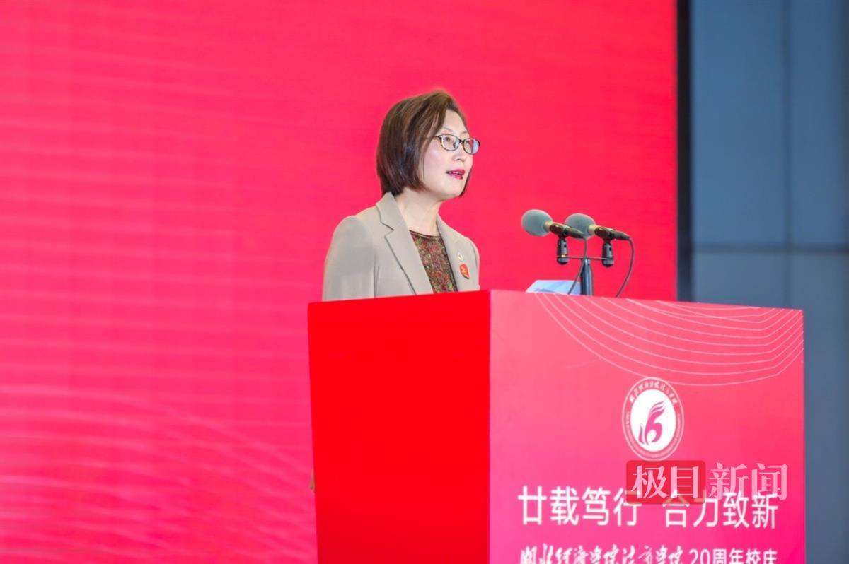 湖北经济学院校长方洁致辞,她向出席大会的各位领导、嘉宾、校友,表示最诚挚的欢迎,向一直以来指导、支持学校发展的湖北省教育厅、中国高等教育学会、中国民办教育协会、湖北省高等教育学会等上级部门、学会组织表示最崇高的敬意!向长期以来关心、帮助学校发展的境内外兄弟高校、社会各界人士和广大校友,致以最衷心的感谢!