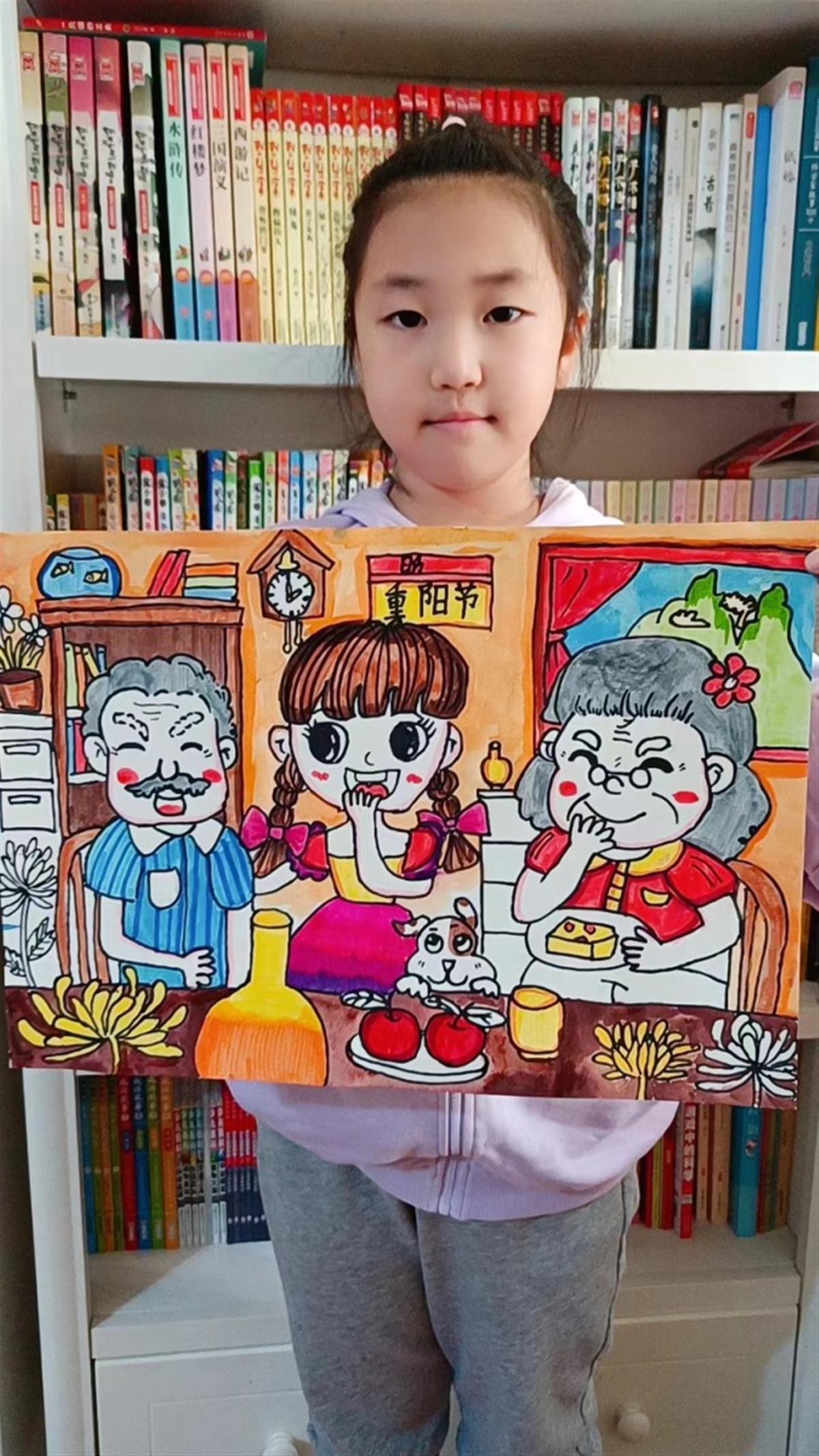 钟家村小学三里坡东校区四(2)班罗诗涵同学说:“百善孝为先,陪伴是最好的孝心。我非常想念远方的爷爷奶奶,希望时光慢一点,不要再让他们变老了。我给他们画了一幅画,送去美好的祝福——爷爷奶奶,祝你们幸福安康,重阳节快乐!”