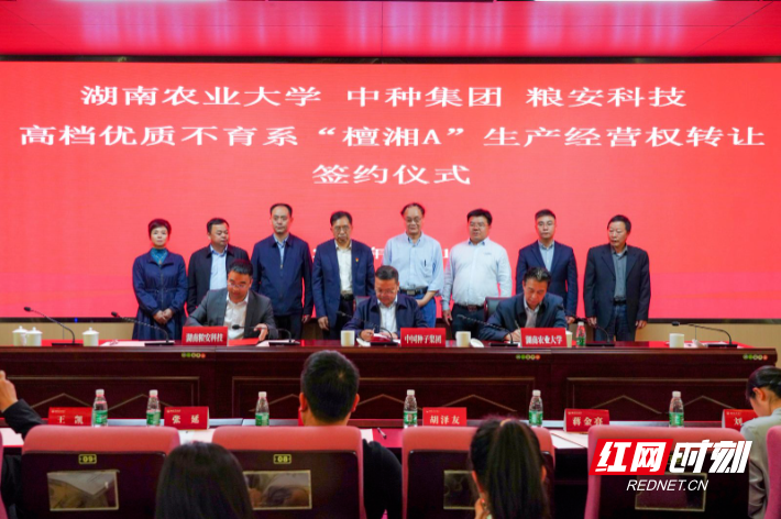 4月11日,湖南农业大学、中国种子集团和湖南粮安科技股份有限公司在长沙举行高档优质水稻三系不育系“檀湘A”的生产经营权转让签约仪式。