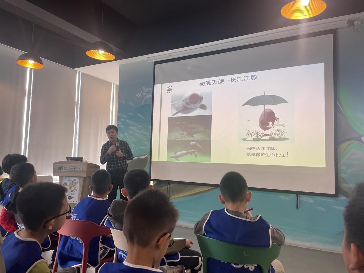 接着,讲座屏幕上出现“保护长江江豚 就是保护生命长江”的字样。“这句话,怎么理解?”张新桥继续激发大家的思考。有小朋友试着回答:“它应该是长江生物链里处于最顶端的物种吧。”张新桥笑着示意回答正确。