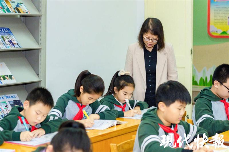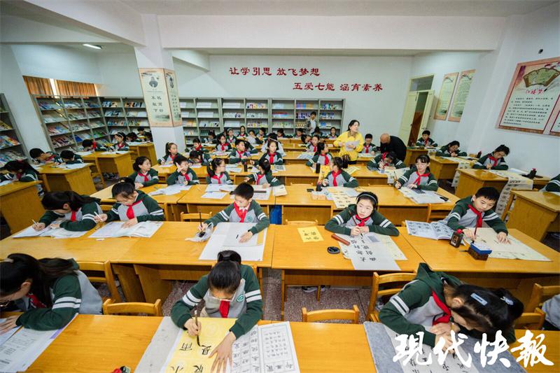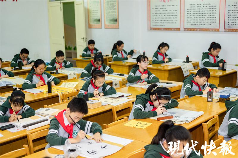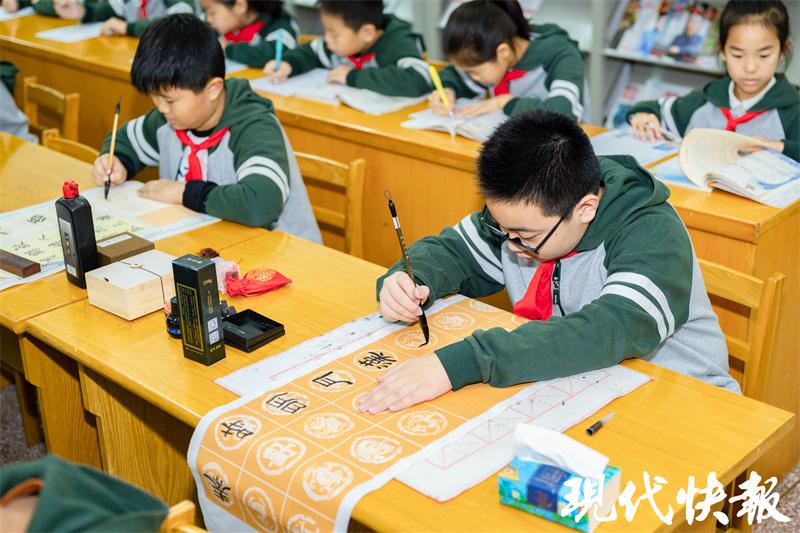"孩子们抬头挺胸,端正坐姿,正确握笔,记住书写的三个一口诀。"该校副校长程晓琳和教导处副主任李朝辉在现场指导孩子们认真比赛。"我们经常组织书法社团活动,每周四的延时服务时间有近2个小时的书法课,还邀请书法家走进校园,与孩子们互动。"李朝辉说。