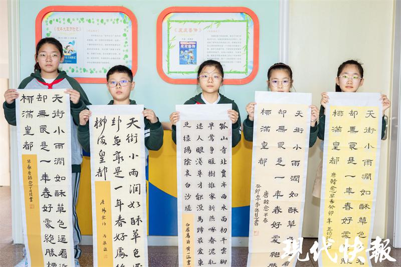 "我在幼儿园就喜欢练铅笔字了,到了小学二年级主动要求学习的毛笔字。"六(18)班的冯乐游毛笔过了九级,他的草书刚劲有力。五(11)班的常品谦和六(19)班的崔芷涵的毛笔字也成熟老道。"练字不是一朝一夕的事情,坚持了,认真了,便体会到其中的乐趣。"两人异口同声。