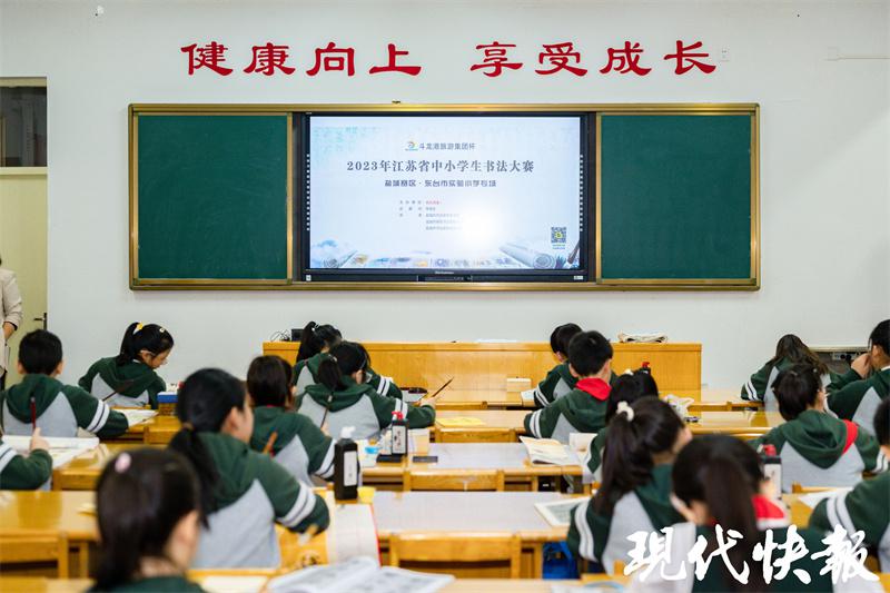 现代快报讯(记者姜振军文/摄)立字即立人,成长即成才。10月25日,"斗龙港旅游集团杯"2023年江苏省中小学生书法大赛盐城赛区的比赛在东台市实验小学举行,孩子们在方圆之间,享受书写带来的快乐,接受优秀传统文化的洗礼。