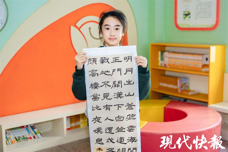 在软笔小选手中,女生张潇文的字也格外亮眼。"我过了毛笔十级,现在每天还会抽时间在家里练习。"张潇文的妈妈是一名英语老师,自从孩子学习练字后,她也经常陪孩子一起练,"我妈妈的字现在也很漂亮。"