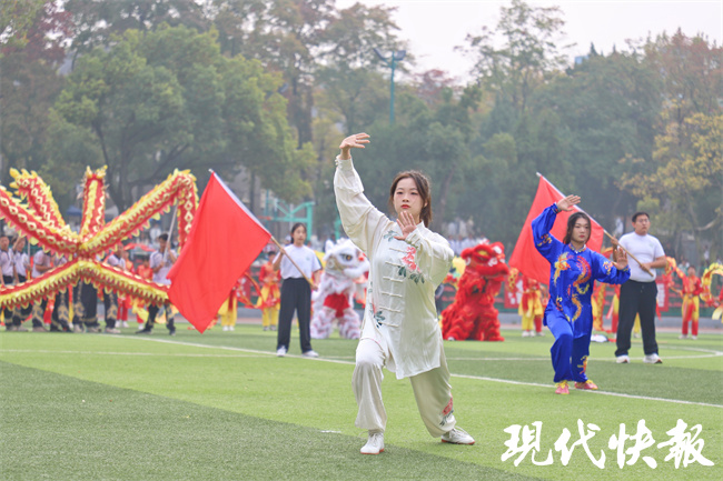 刀剑闪烁、棍枪起舞、拳脚刚劲……除了舞龙舞狮队,开幕式现场还表演了中国传统武术,飒爽英姿尽显武术之魂。现代快报记者了解到,南京农业大学龙狮协会成立于2006年,社团以“弘扬中华传统文化,体育强则中国强”为宗旨,发扬“忠义、崇礼”的龙狮精神。前不久,由龙狮协会成员组成的学校舞龙队于2023年获第十五届全国舞龙舞狮锦标赛舞龙规定(混合组)第二名。