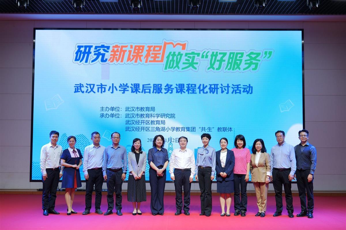 “双减”背景下,小学课后服务如何研究新课程,做实“好服务”?11月2日,武汉市教育局主办,武汉市教科院、武汉经济技术开发区教育局和武汉经济技术开发区三角湖小学教育集团承办的小学课后服务课程化研讨活动在新华小学举行,现场通过优秀案例的展示,聚焦如何建构“1+X”课后服务模式,打造具有武汉特色的课后服务课程体系,活动由武汉市教科院小学教研室主任谢琼主持。