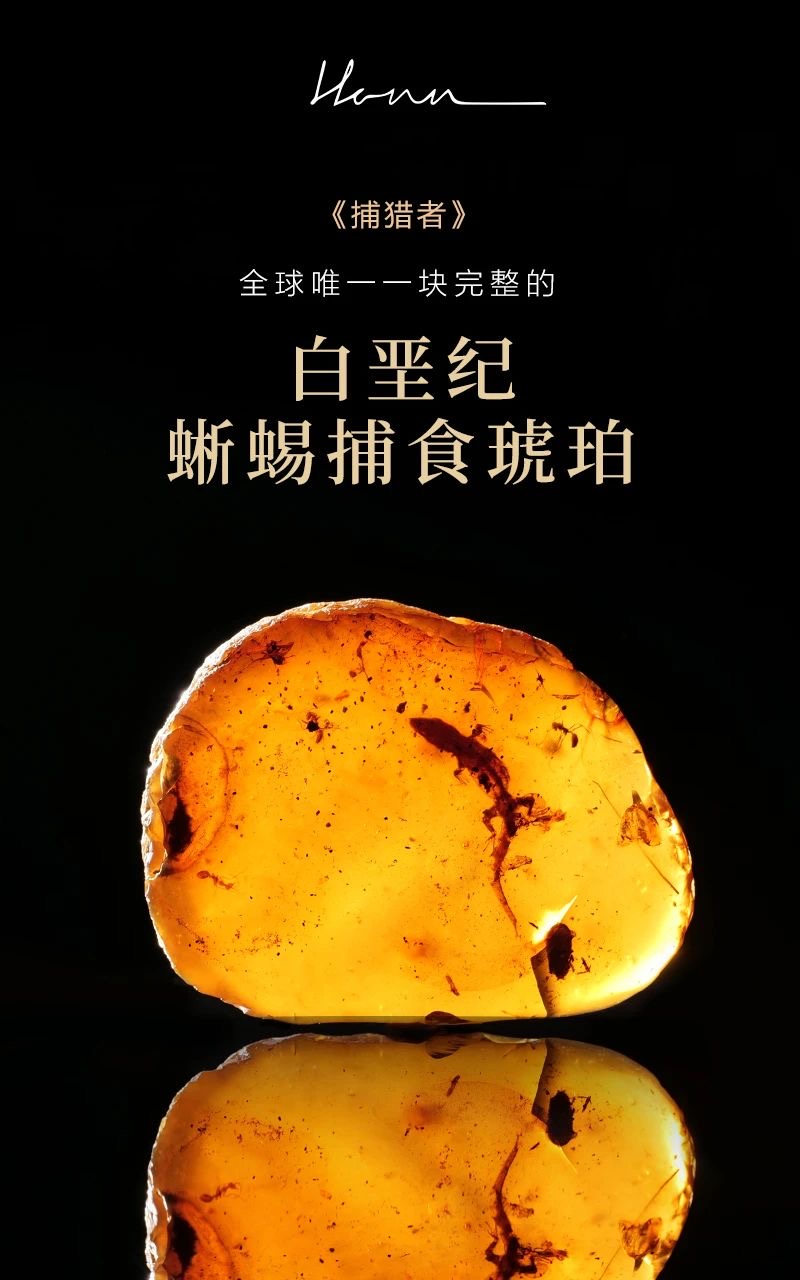 其中,《捕猎者》琥珀内部珍藏了一只恐龙时代的脊椎类爬行古生物——白垩纪蜥蜴,其强大的力量和极高的敏捷度,使其在琥珀中完美保存的机会极为罕见。然而,更为引人注目的是这只史前蜥蜴的展示方式。首次曝光于世的这只白垩纪蜥蜴,在琥珀中以一种前所未有的方式、捕猎的动态瞬间呈现。 这一不可思议的珍贵场景,在时间的长河中被永恒凝固。