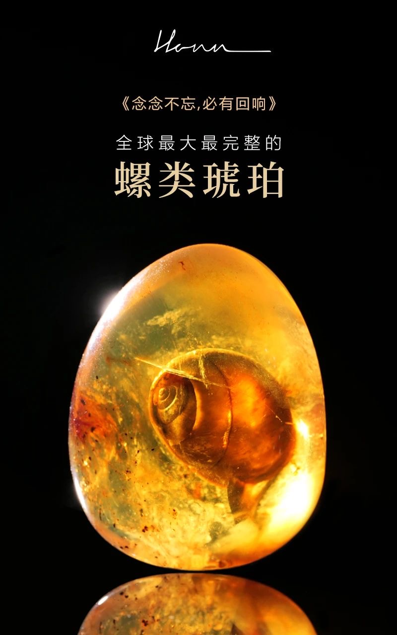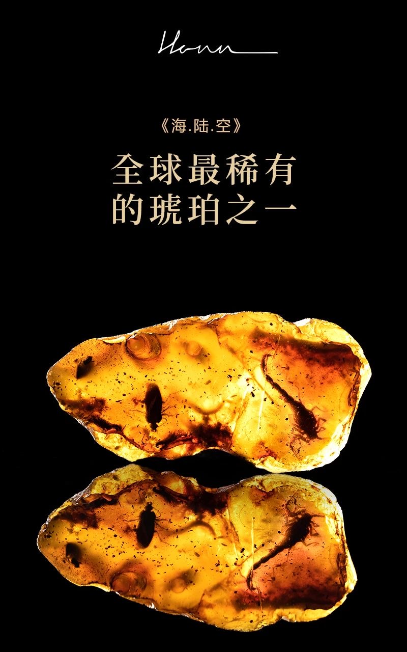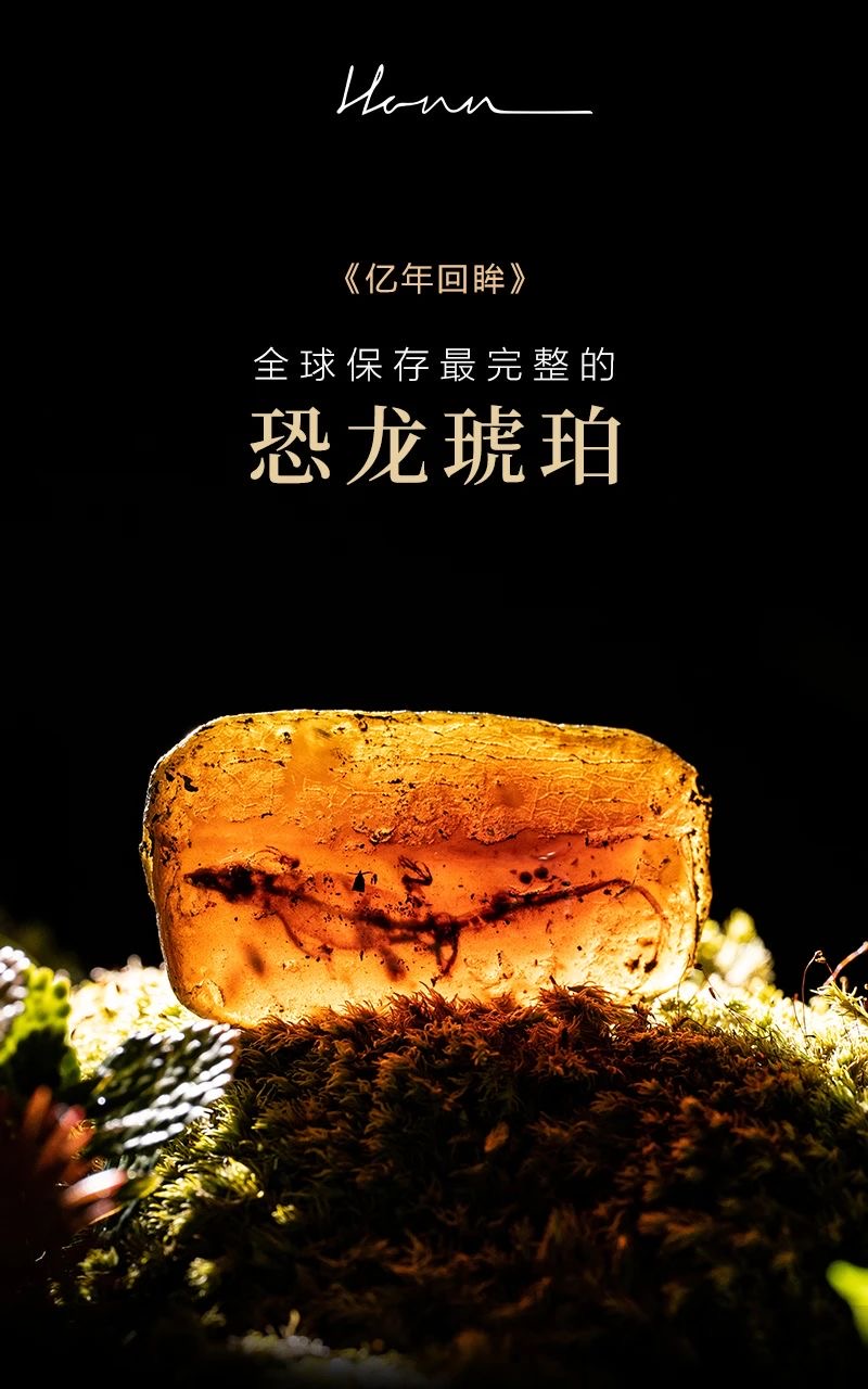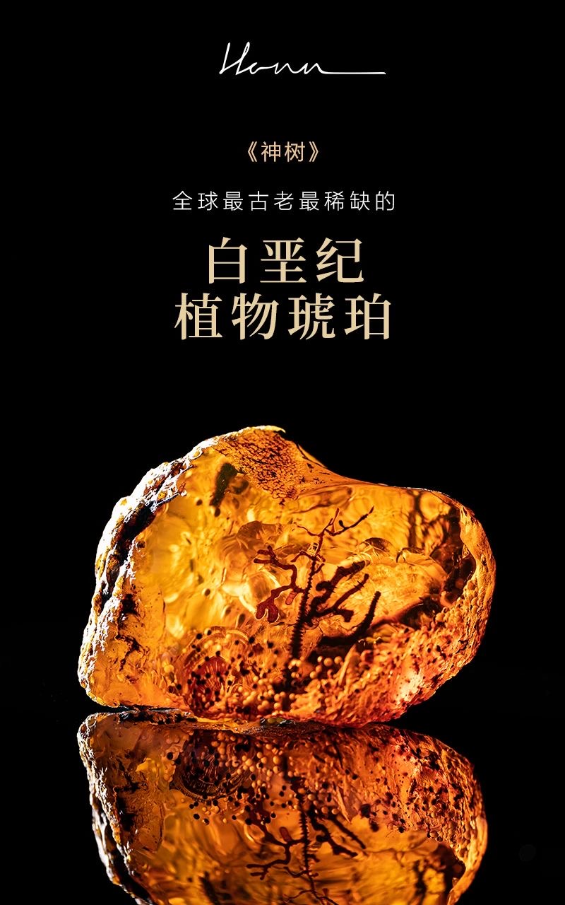Honn参展的其它琥珀藏品也是亮点纷呈,《神树》乃白垩纪植物琥珀,因神似中国三星堆青铜神树而得名;《亿年回眸》是Honn收藏系列中保存最完整的珠宝级白垩纪古脊椎动物琥珀;《海陆空》罕见地在同一块琥珀中出现白垩纪史前马陆(水栖)、史前蝎子(陆生)、史前豆娘(飞行)三种不同生活环境的史前生物;《一珀一世界》是该系列中最完美的白垩纪蜥蜴与昆虫琥珀;《力量》是最大、形态保存最完整的蝎子琥珀,这个品种的鳌蝎已经在白垩纪灭绝;《复活的恐龙》则是最清晰的白垩纪古脊椎动物骨骼琥珀之一,其包裹体包括白垩纪恐龙羽毛及疑似某种白垩纪恐龙后腿骨骼;《蜘蛛家族》是系列中唯一一块包含白垩纪完整蜘蛛族群的琥珀,对于史前蜘蛛来说,体型越大意味着越有可能从树脂的黏附中挣脱,如此含有大型蜘蛛的琥珀极为稀有;《发财树》和《白垩纪之窗》均为白垩纪时期已灭绝的植物琥珀;《妙羽》琥珀留下的则是白垩纪已灭绝的恐龙红色羽毛的美妙身影。