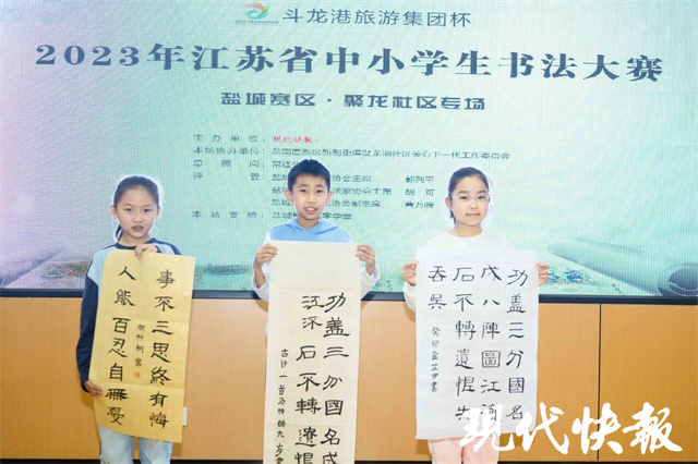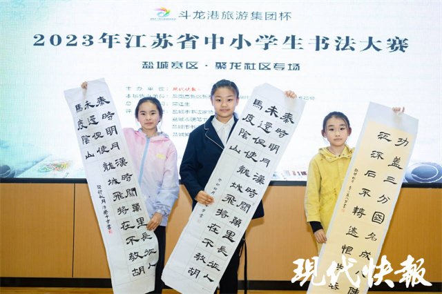 江苏省中小学生书法大赛由现代快报+主办,已成功举办七届。本届比赛的冠名单位盐城市斗龙港生态旅游度假集团有限公司成立于2020年3月,总资产400亿元。集团以斗龙港生态走廊为纽带,以全域旅游为抓手,所属的景区及文旅项目有荷兰花海、梅花湾、大丰知青农场、白驹狮子口会师文化景区、世界遗产地——大丰野鹿荡、新丰920街坊、麋鹿度假村等。