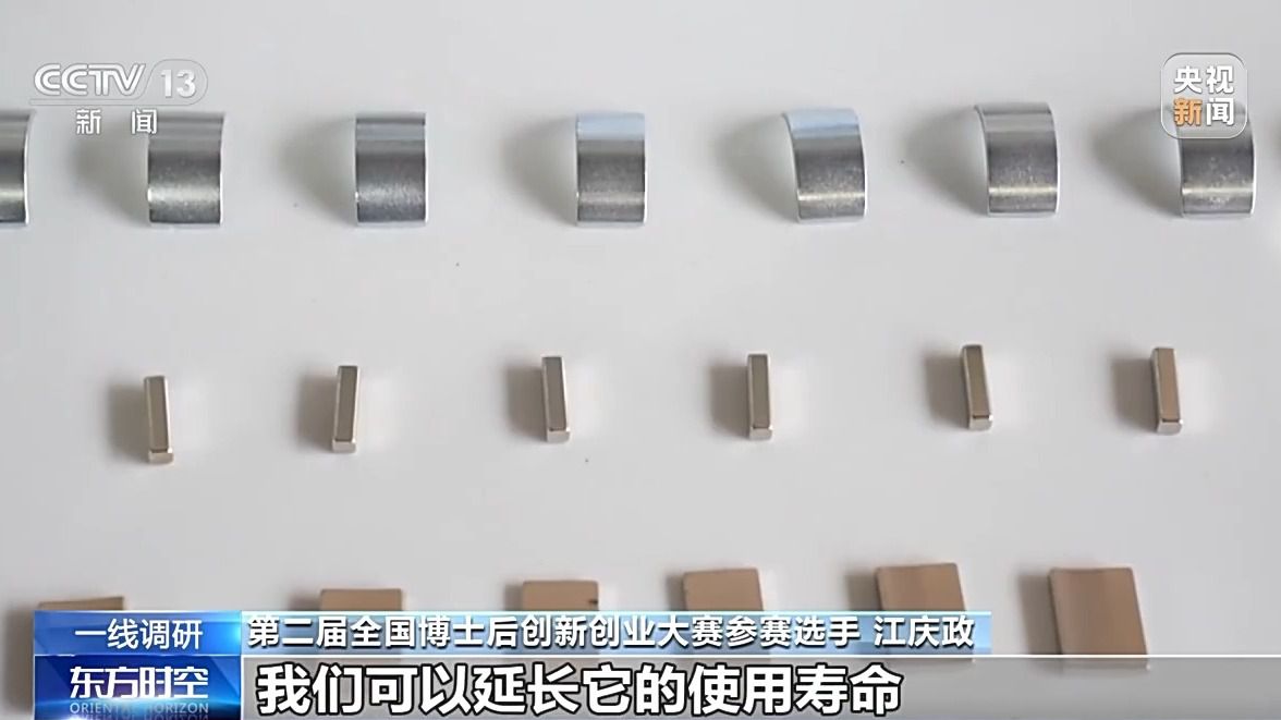 第二届全国博士后创新创业大赛参赛选手 江庆政:如果我们能在磁性能不降低的同时,我们把重稀土的用量只要降低0.05%,那5000吨这样的磁体可以直接节约成本2500万元。成本降下来是一方面,我们可以延长它的使用寿命,就可以实现我们稀土产业很好的绿色可持续发展。