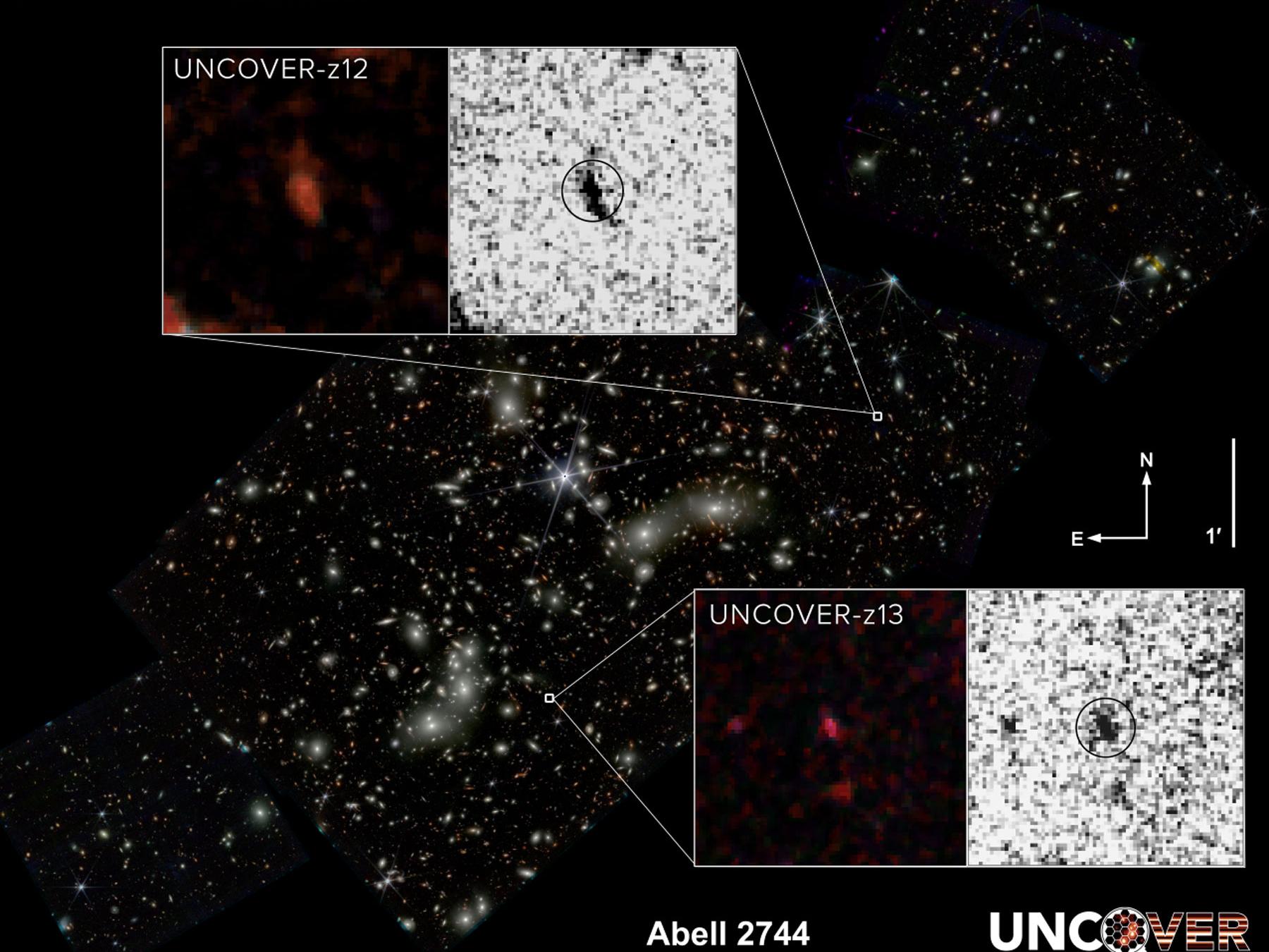 詹姆斯·韦伯太空望远镜的近红外相机已证实迄今为止观测到的第二和第四遥远的星系(UNCOVERz-13和UNCOVERz-12)。这些星系位于潘多拉星系群。