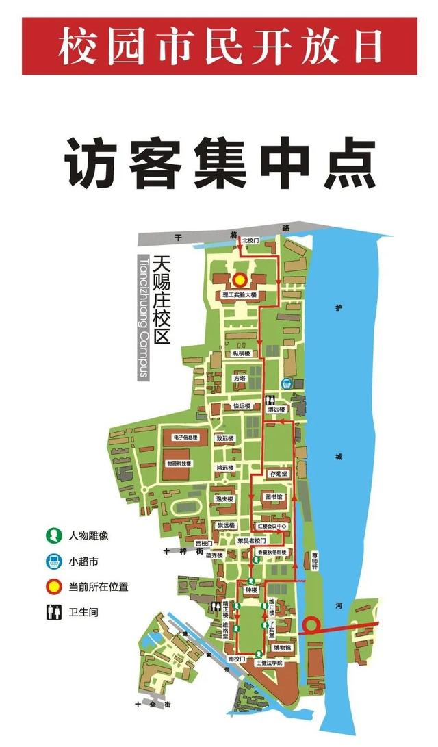 天赐庄校区(本部)北大门—方塔—红楼会议中心—东吴大学老校门—钟楼草坪片区—博物馆—尊师轩—天赐庄校区(本部)北大门。