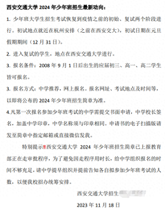 这位老师表示,今年西安交大少年班的相关信息,以学校最终公布的2024年“少年班”招生简章为准。