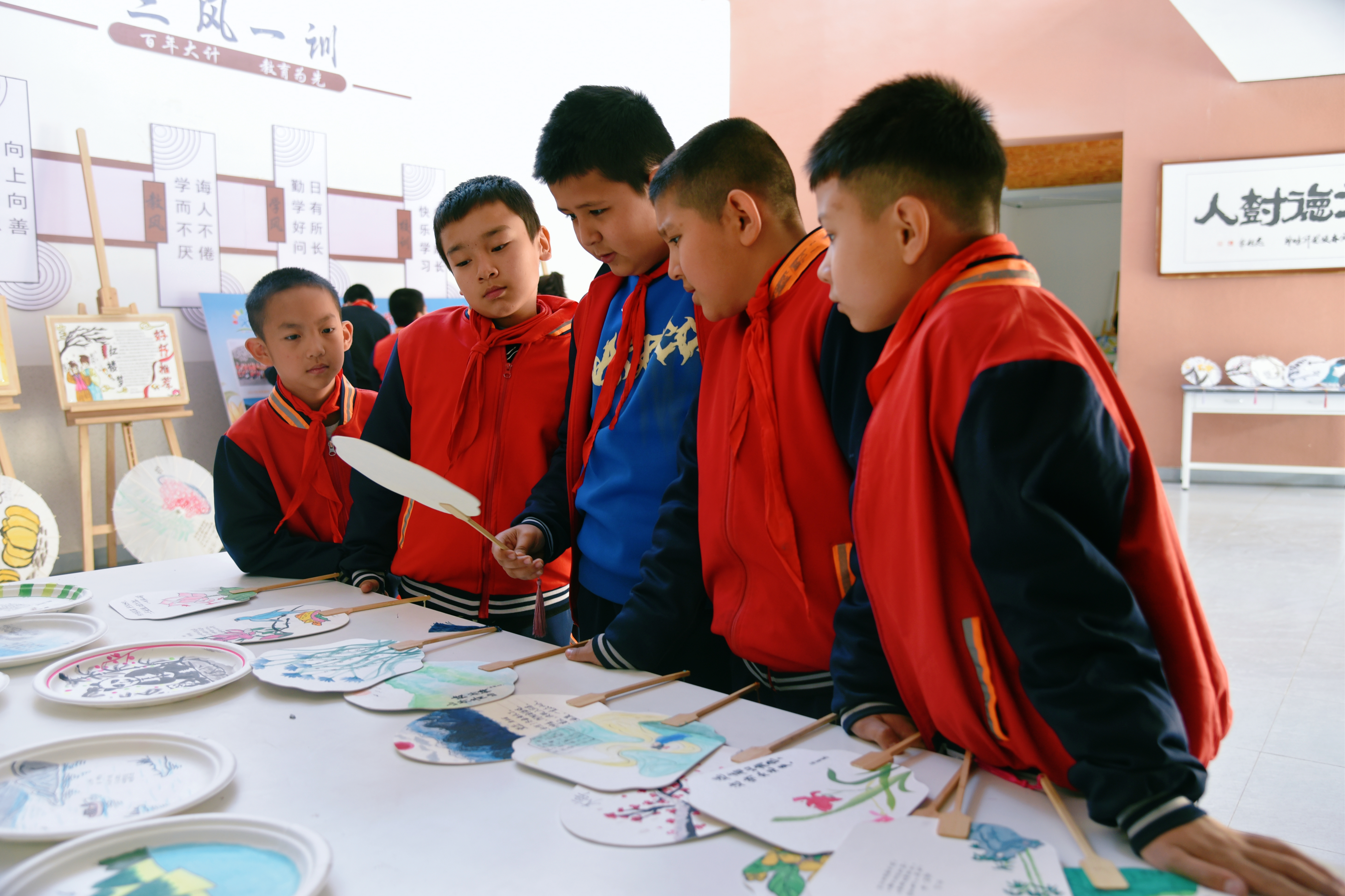 11月18日,和田市北京海淀小学学生正在欣赏绘画作品。张亚辉摄