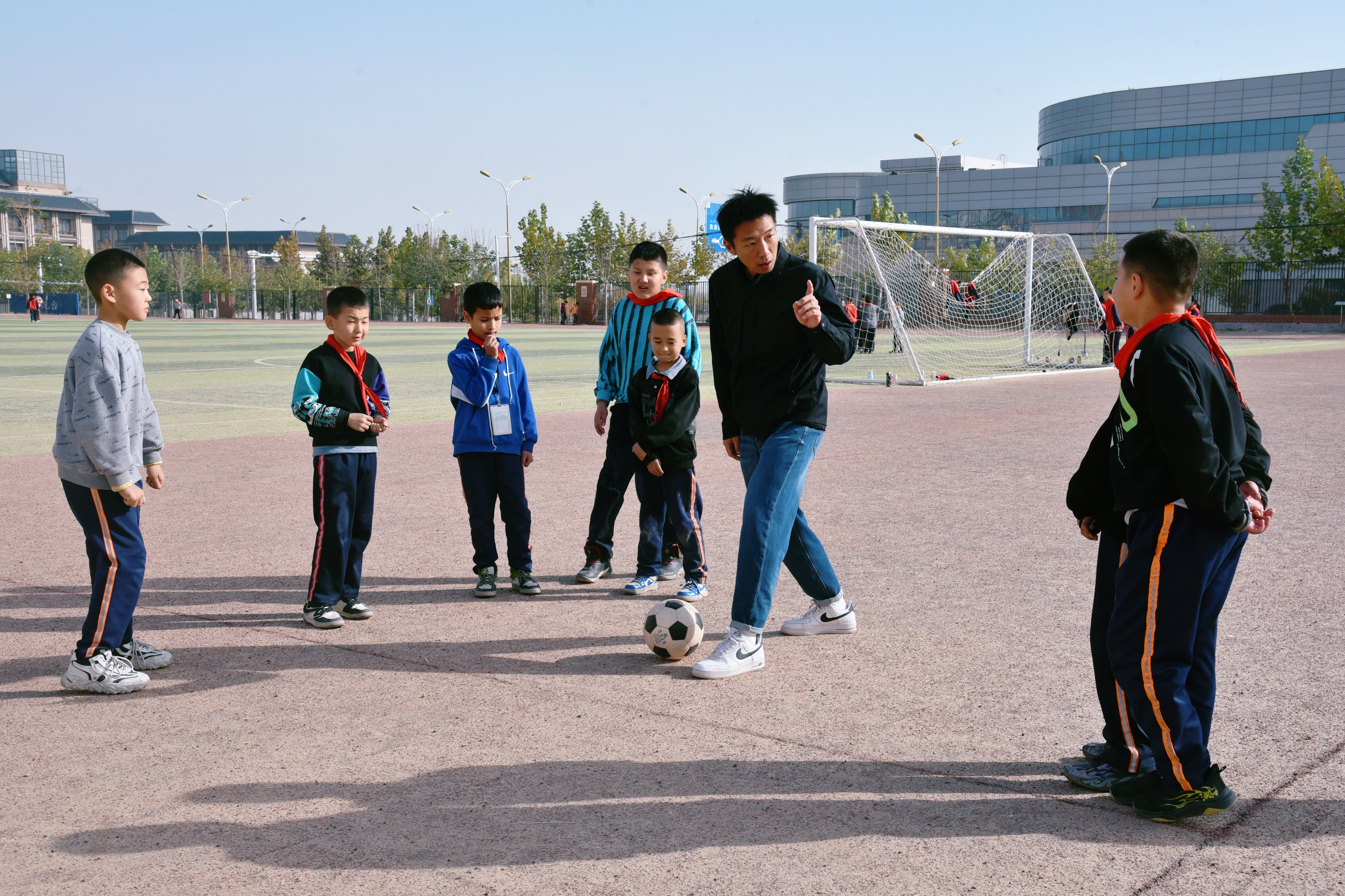 11月18日,和田市北京海淀小学援疆教师李戈给学生上体育课。张亚辉摄
