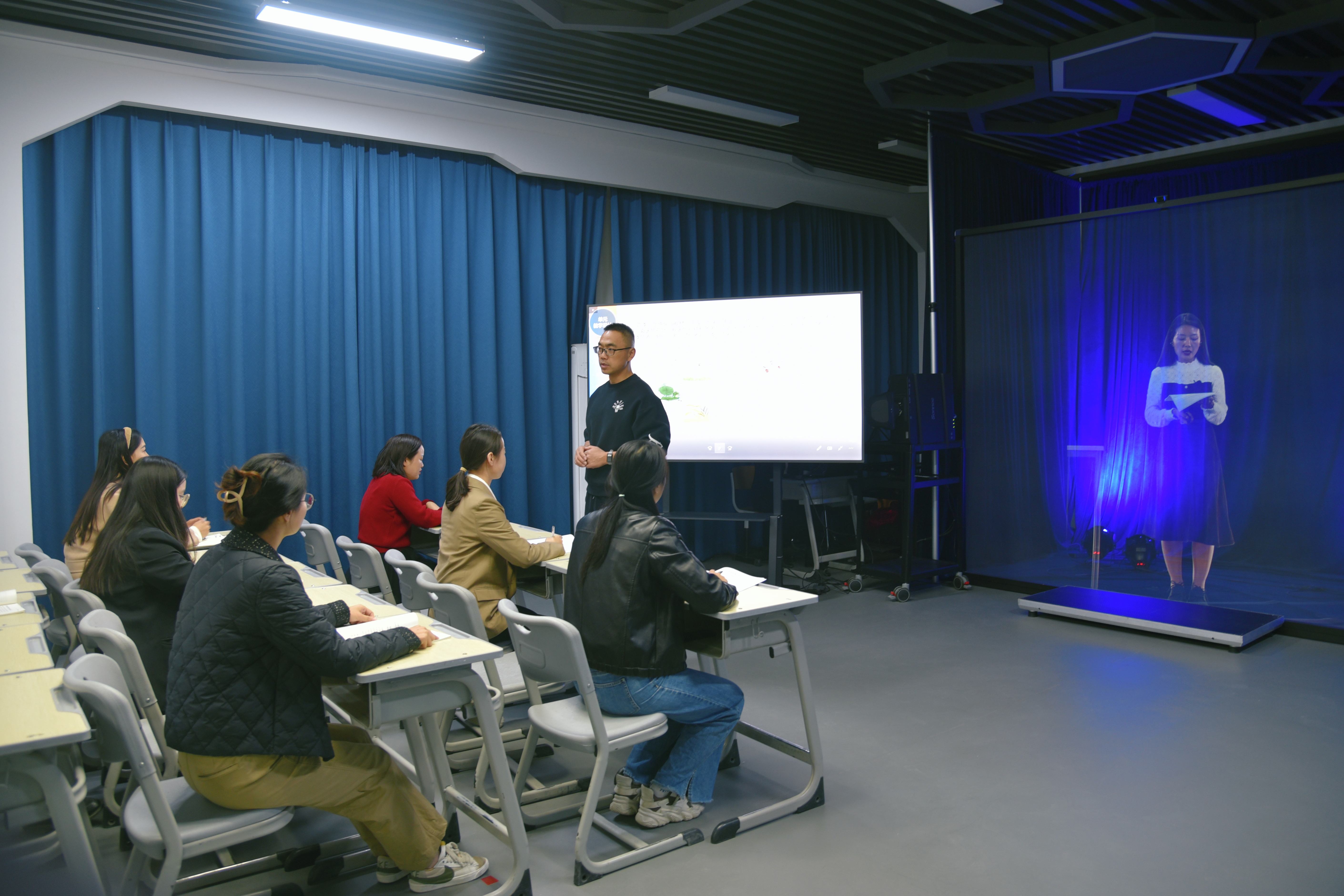 和田市北京海淀小学的教师在5G全息投影教室听讲座。张亚辉摄